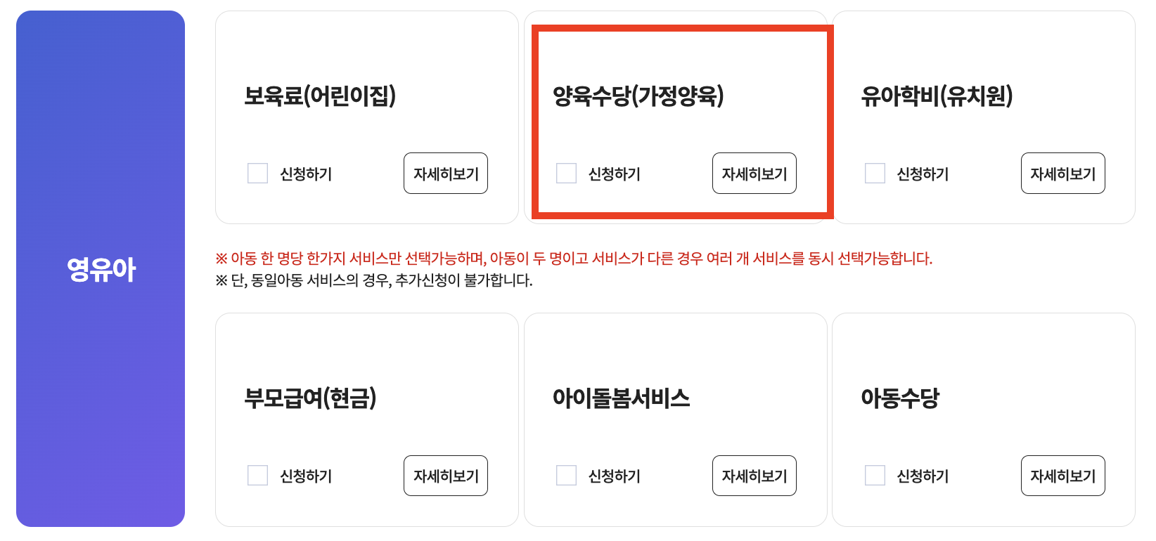 양육수당은 24개월부터 미취학아동까지 어린이집, 유치원, 종일제 아이 돌봄 서비스를 이용하지 않고 가정에서 양육되는 아이에게 지원(매달 10만 원)