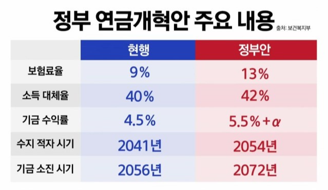 연금액을 결정하는 소득 대체율을 현재는 40%인데, 개혁안에는 42% 이상까지 깎지 않고, 현행을 유지합니다.