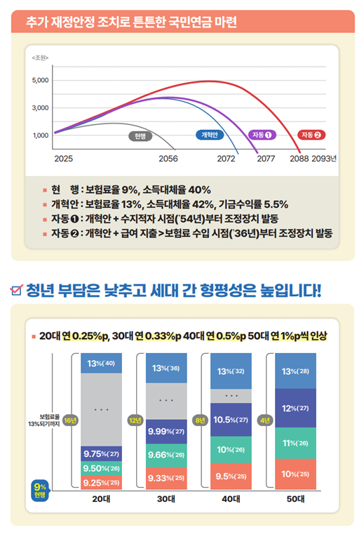 ■ 자동조정장치는 세대 간 형평성을 높일 수 있습니다. 한 세대만 과도한 부담을 지거나 한 세대만 혜택을 보는 구조를 막기 위함이기 때문에 모든 세대가 공평하게 나눌 수 있는 방향으로 제도가 운영됩니다.