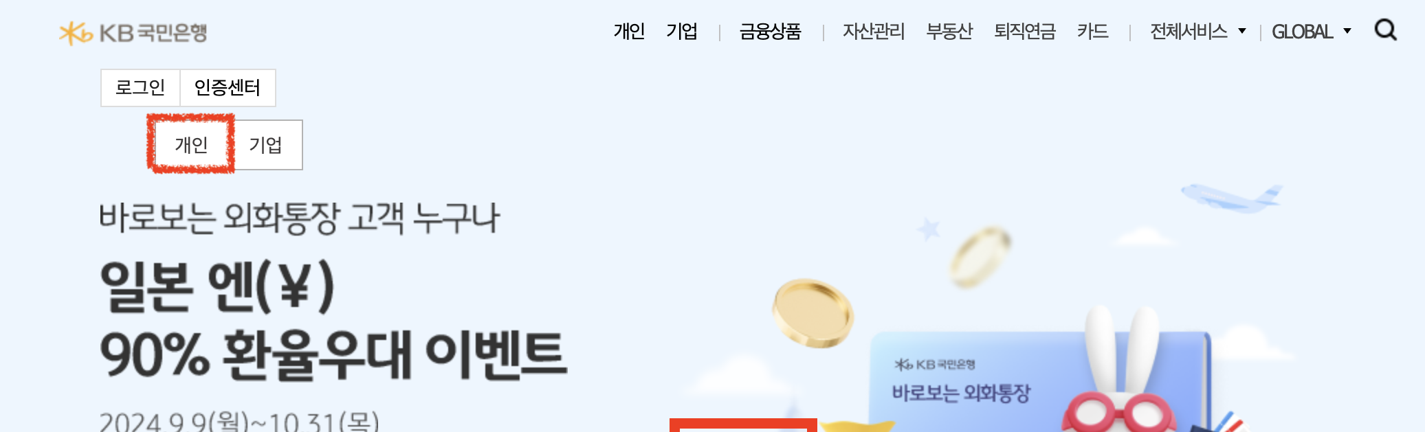 1. 자주 사용하는 은행 홈페이지로 들어가서 인증센터-개인을 누릅니다.