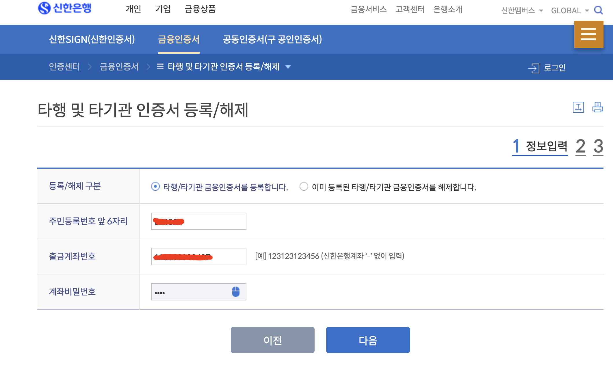 안내된 대로 주민번호와 계좌번호, 비밀번호를 입력하고 다음으로 누릅니다.
