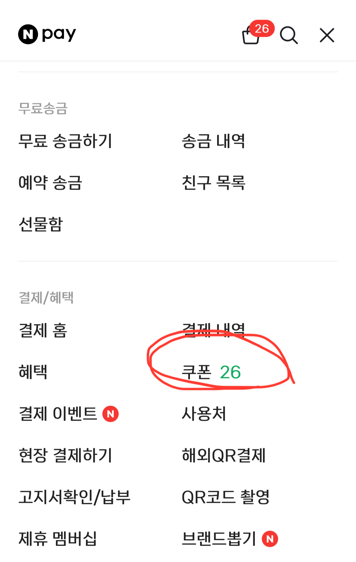 3. 눌러서 스크롤로 아래로 내려주면 결제/혜택이라는 곳에 쿠폰이라고 되어있습니다. 눌러줍니다.