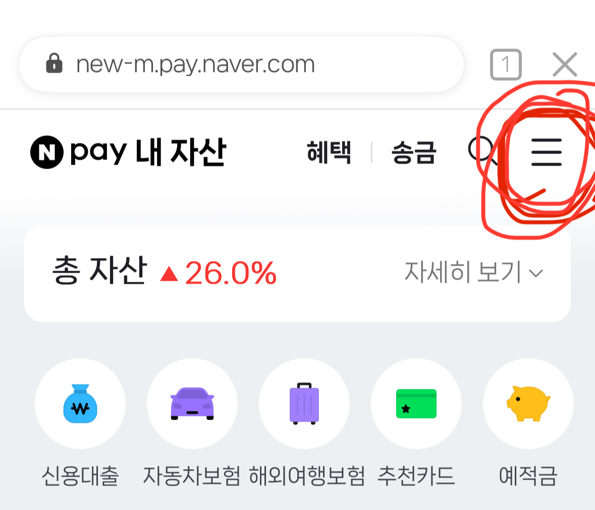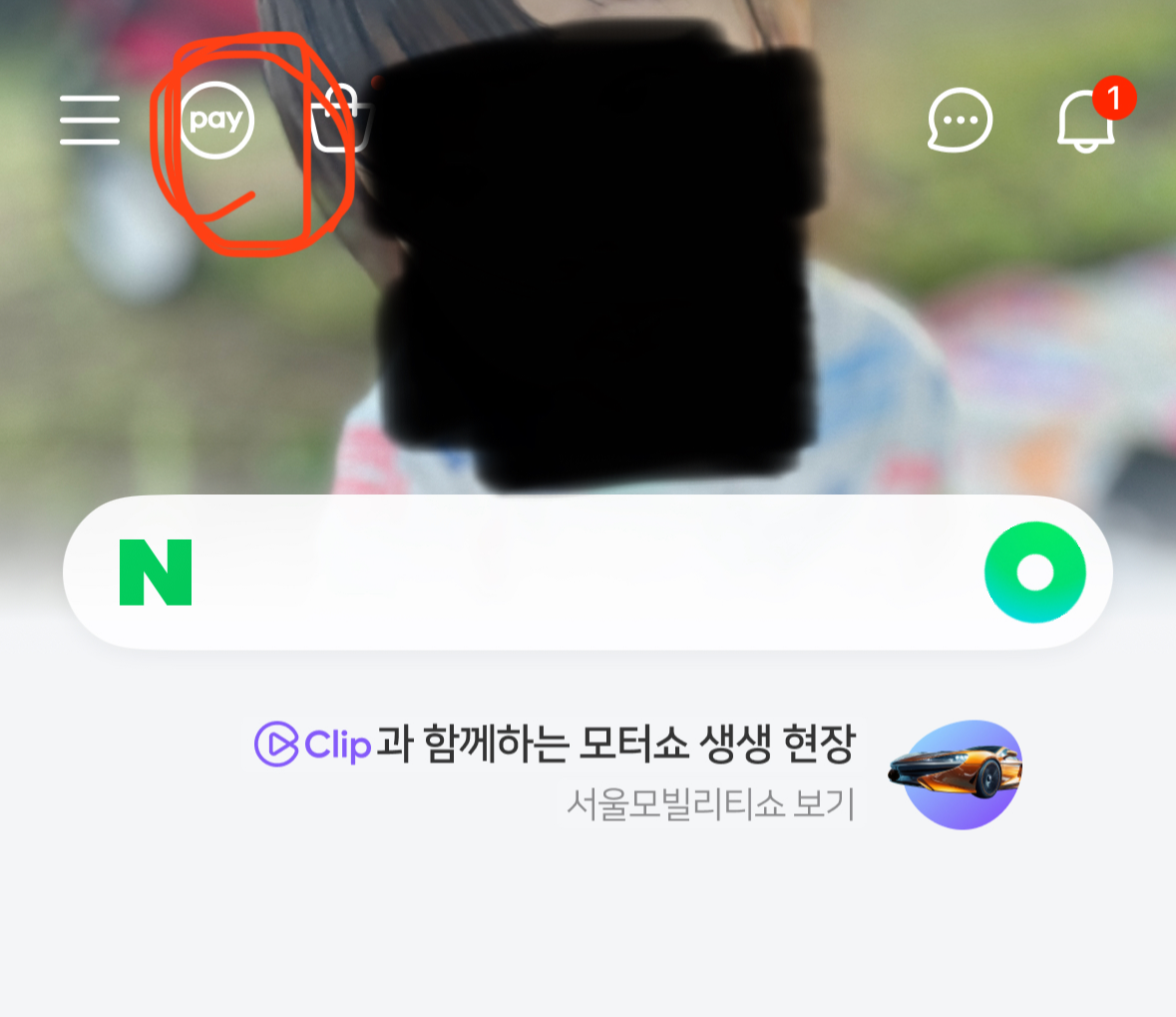 1. 네이버 앱 첫 화면에서 오른쪽 위에 pay라는 동그라미를 클릭합니다.