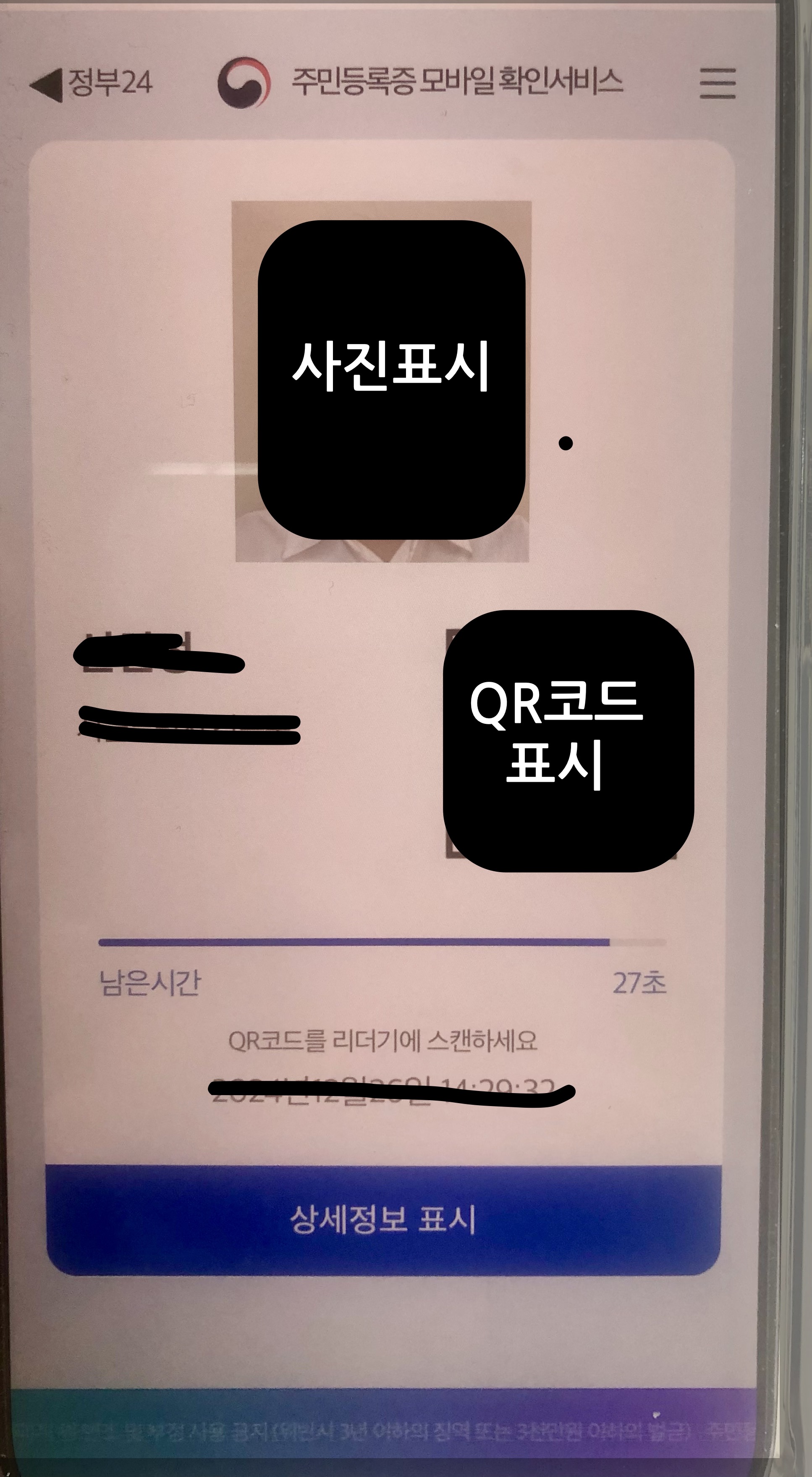 8) 주민등록증에 있는 사진과 QR코드가 나옵니다.