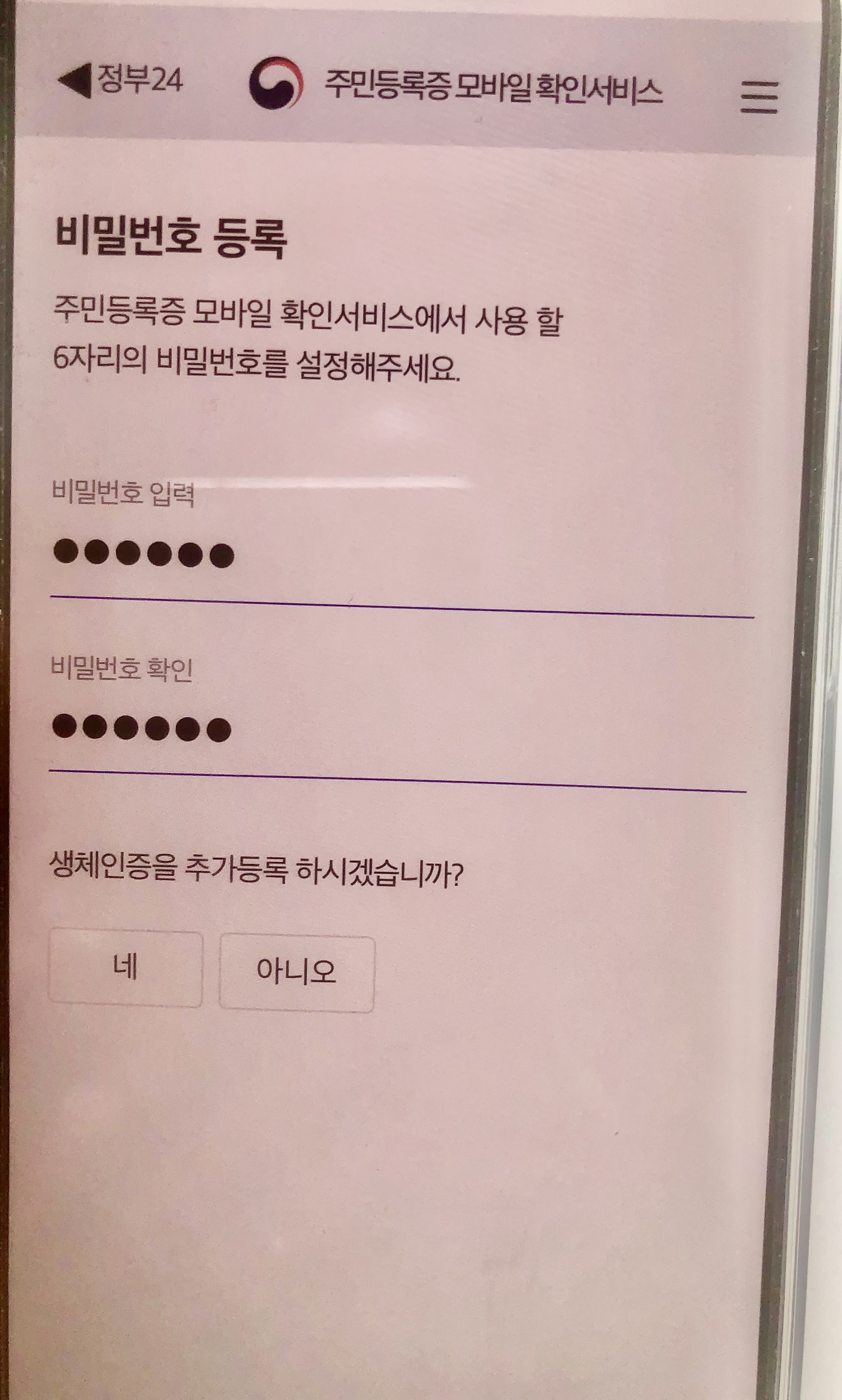 6) 실제로 확인할 때 사용할 비밀번호를 등록합니다. (6자리)