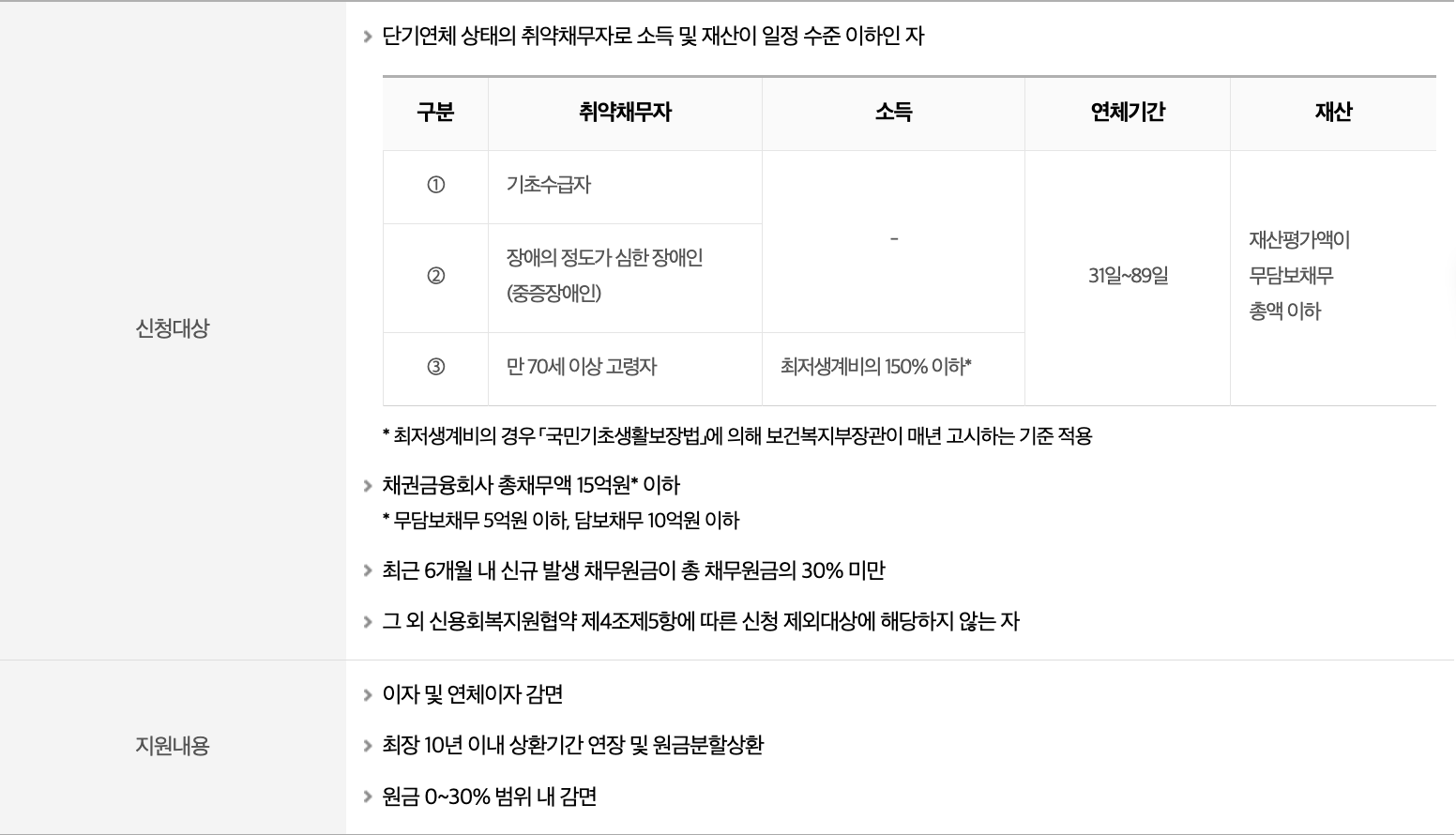 신용카드대금이나 대출금 등이 3개월 이상 연체된 경우 채무감면, 상환기간 연장 등을 통해 채무상환을 도움을 줍니다.