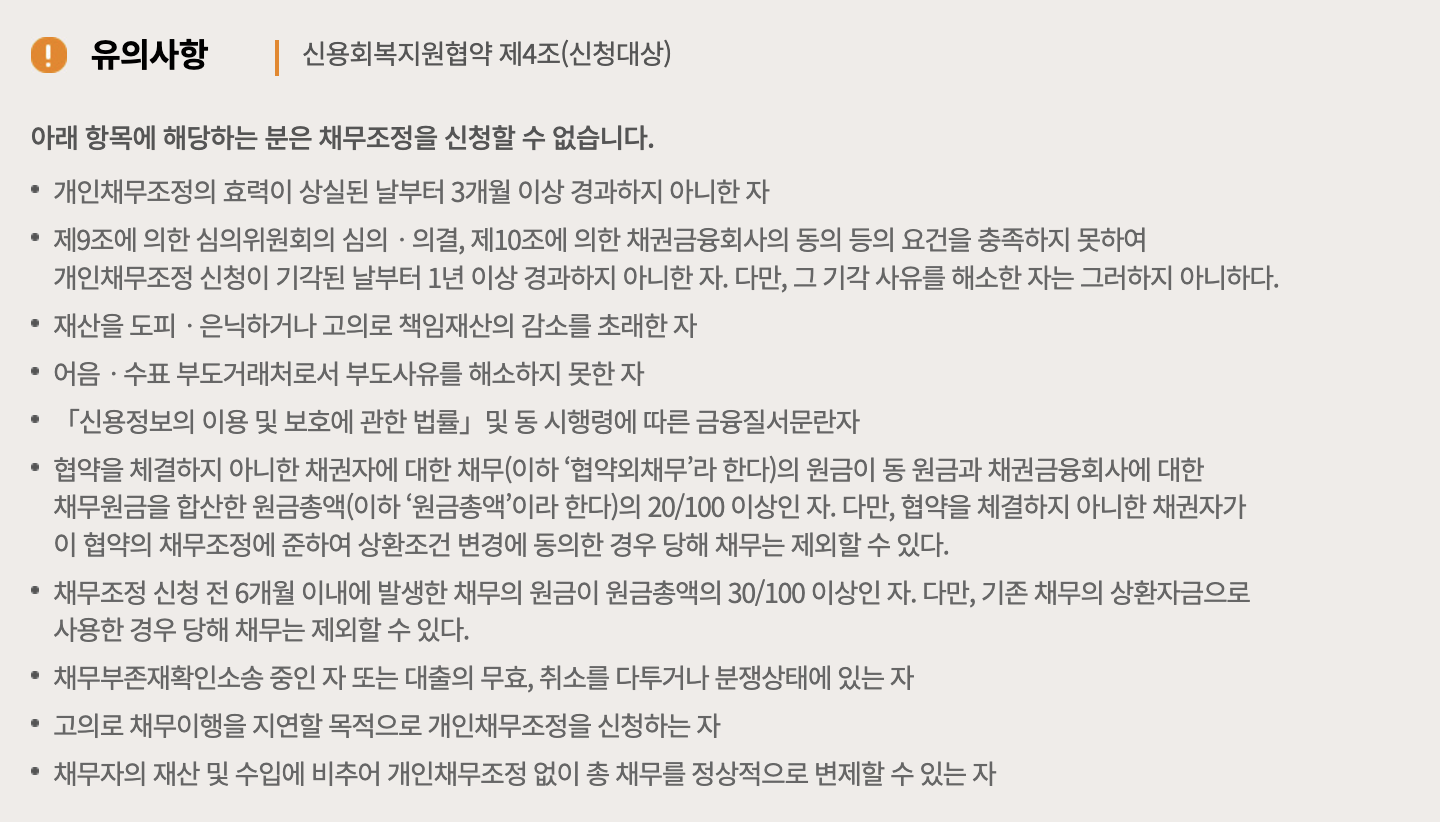 - 담보대충(부동산, 보증서, 자동차 등)은 채무조정에 제외될 가능성이 있음