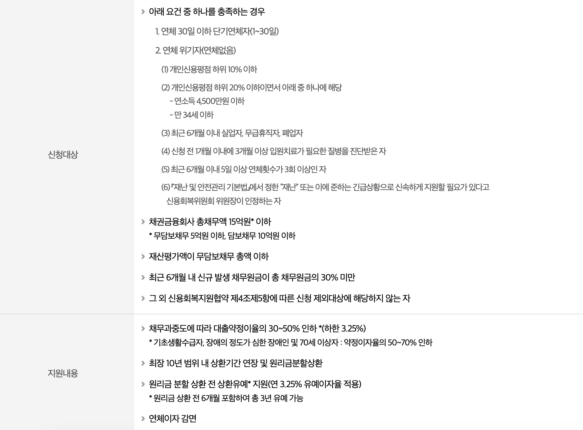 - 조정이자율은 채무 과중도에 따라 대출 약정이율의 30-50%를 인하하고, (하한 연 3.25%)