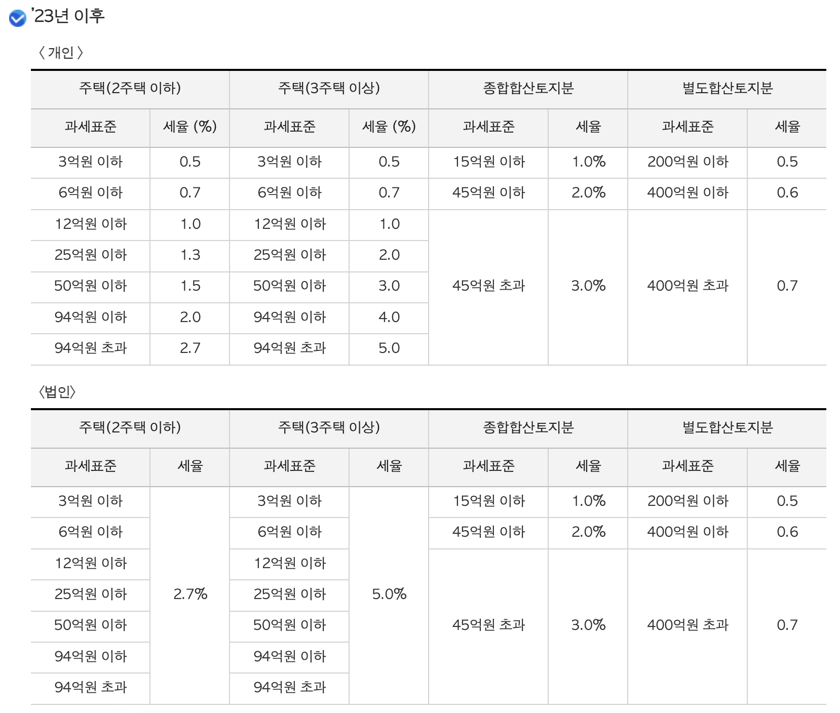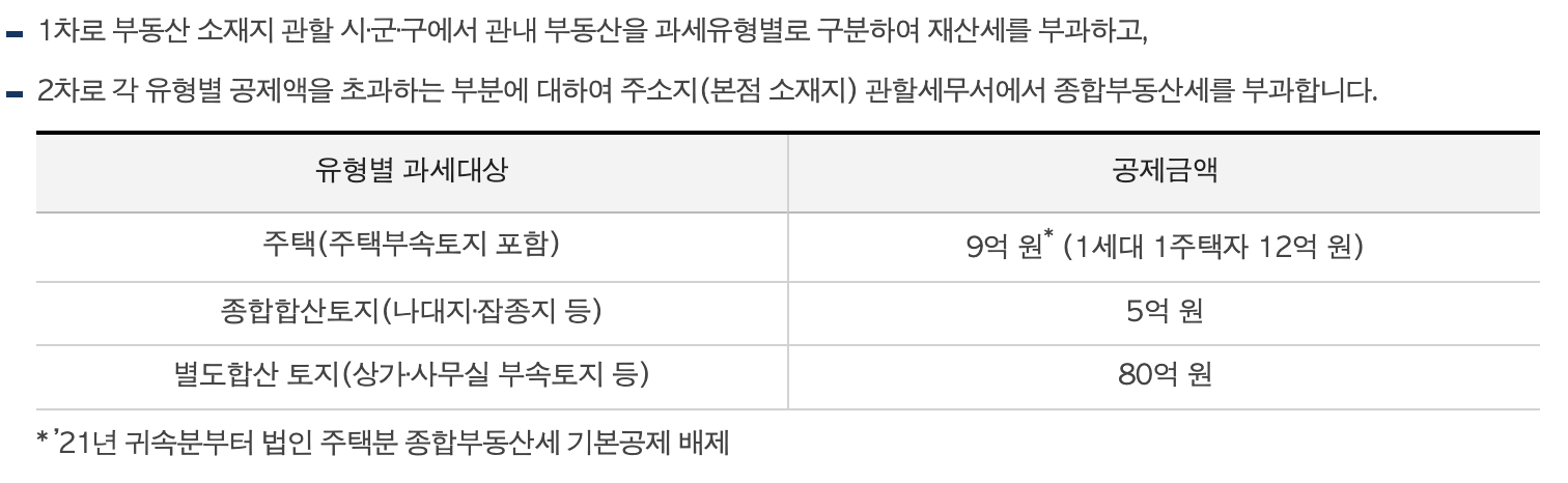 과세기준일(매년 6월 1일) 현재 국내에 소재한 재산세 과세대상인 주택 및 토지를 유형별로 구분하여 인별로 합산한 결과, 그 공시가격 합계액이 각 유형별로 공제금액을 초과하는 경우 그 초과분에 대하여 과세되는 세금입니다. 한마디로 공시가격 합계액이 공제금액을 초과하는 경우, 그 초과분에 대하여 과세되는 세금입니다.