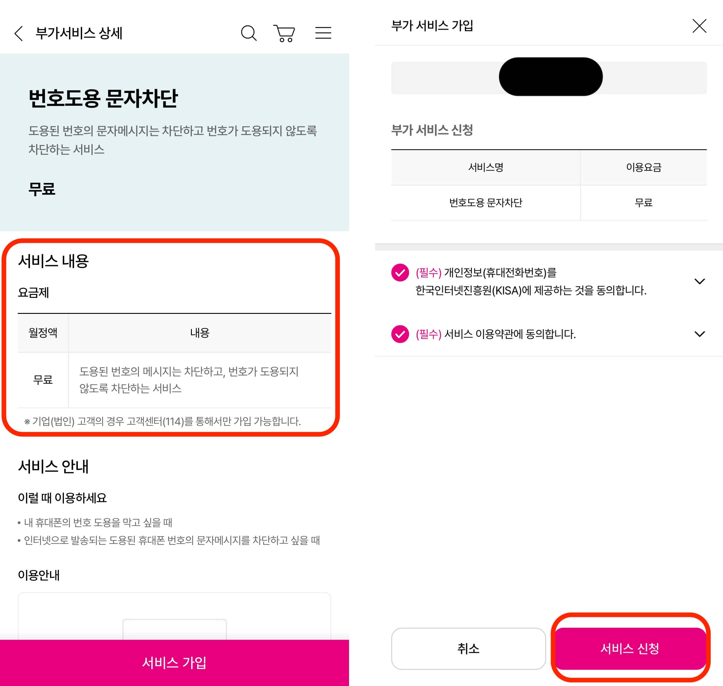 > 번호도용 문자차단도 서비스 내용을 확인하고 서비스 가입과 확인을 눌러줍니다.